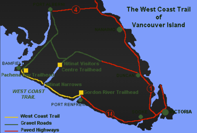 To get to Vancouver Island, you can either fly directly into Victoria, BC or Nanaimo BC, depending on where you are wanting to start the West Coast Trail. You can also fly into Vancouver and take the ferry over to again, either Victoria, BC (Shwartz Bay) or Nanaimo (Departure Bay, or Duke Point). If you are wanting to start from North to South (Pachena Bay) you will want to go to Nanaimo for the qucker route. If you want to do the trail from South to North (Gordon River) then going to Victoria is your quicker route.